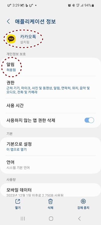 2. 위 화면의 2번 항목을 누르면 카카오톡 알림(허용됨)으로 설정하시면 됩니다.