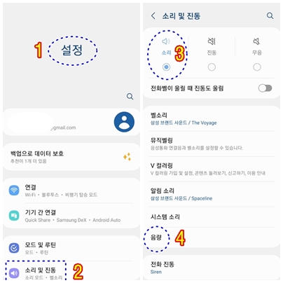 설정방법 : 설정 → 소리 및 진동 → 소리선택 → 음량(음향조정)