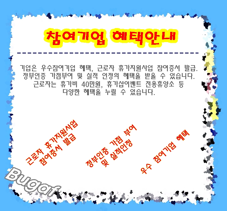 근로자의 휴가지원사업으로 자유로운 문화조성과 국내여행 활성화를 위해 정부와 기업이 함께 근로자의 국내여행 경비(휴가비) 지원사업에 많은 참여와 많은 분들이 즐거운 여행을 떠날 수 있었으면 합니다.