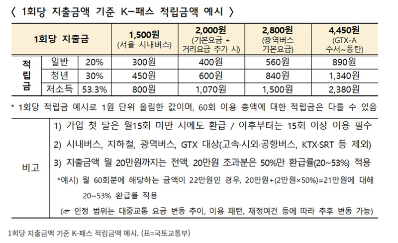 결론부터 말씀드리면 대중교통비 20%에서 최대 53%까지 환급해 주는 K-패스가 5월 1일부터 시행됩니다.