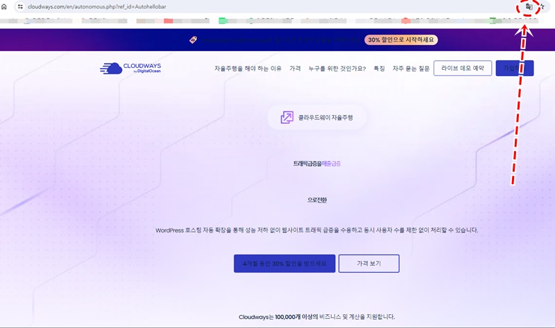 위의 이미지 처럼 사이트 접속 시 자동번역이 안 될 경우 화살표의 아이콘을 클릭하면