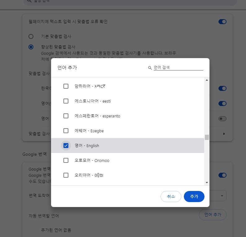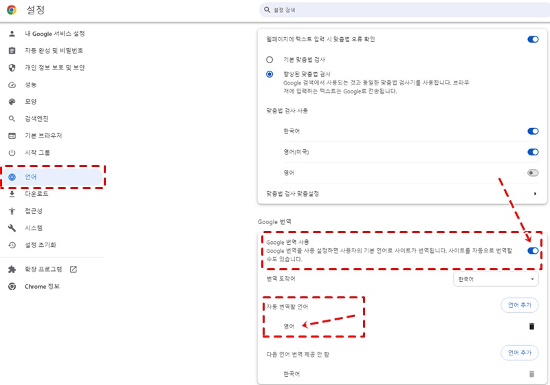 ▷ 왼쪽 메뉴바 : 언어 > 오른쪽 > Google 번역 설정란 활성화 > 자동번역할 언어 선택 (저는 영어)