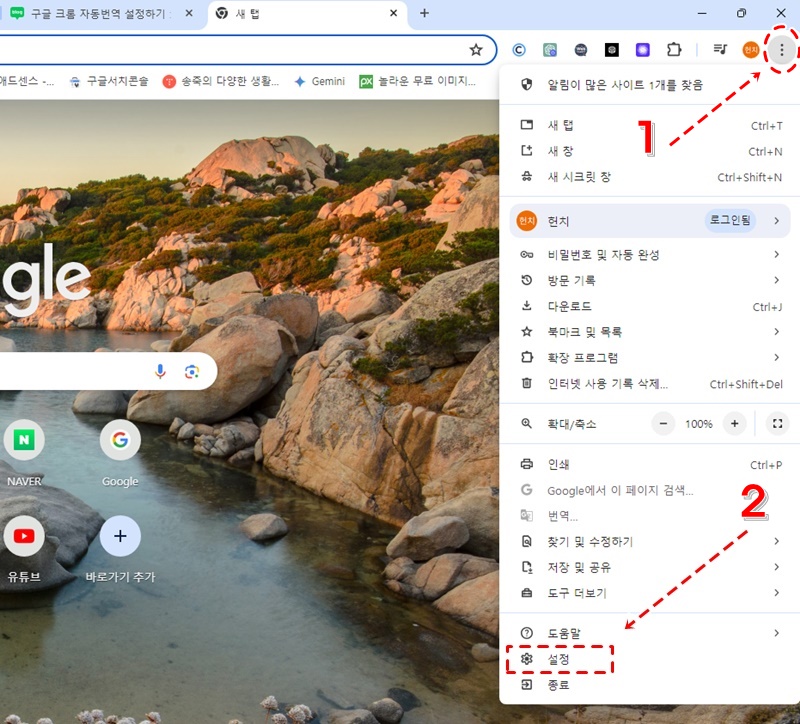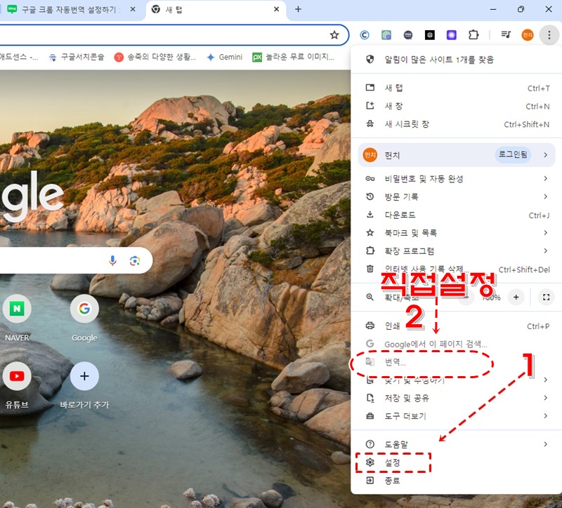 ▷ 설정 3. : chrome 맞춤설정 및 제어 > 번역 클릭 (직접번역설정)