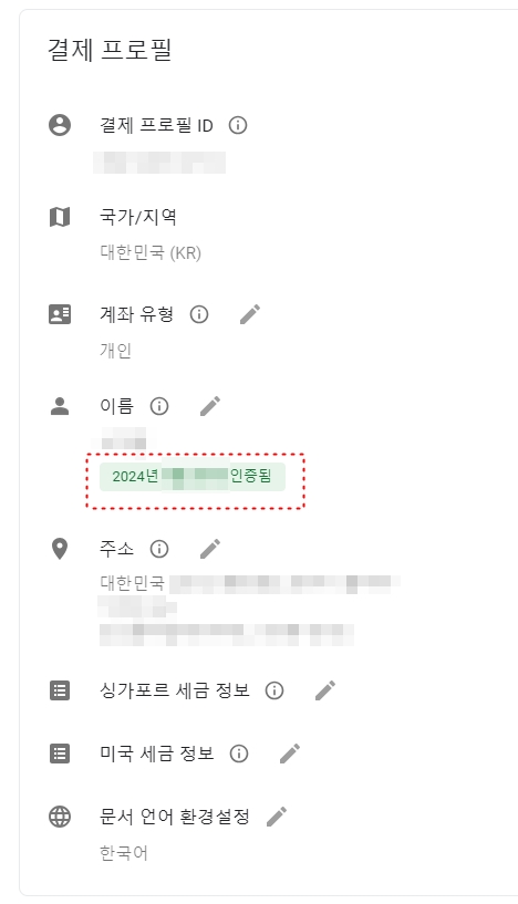 ▷. 애드센스 계정 로그인 > 지급 > 지급정보 > 설정관리 > 결제 프로필 - 이름 및 주소변경 > 수취인 이름으로 변경