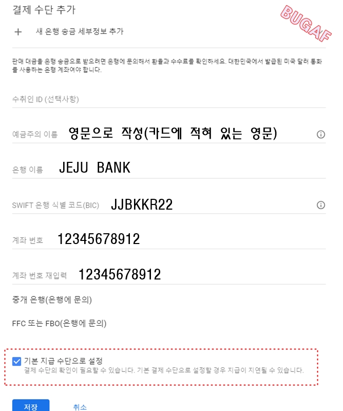 등록 시 이름, 은행 등을 변경하시면 됩니다.
