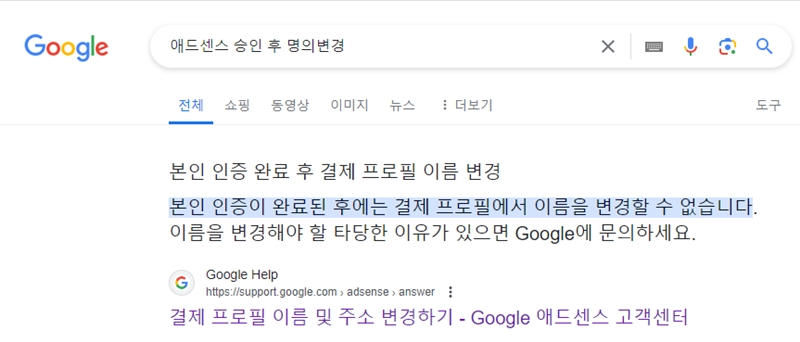 ▷ 애드센스에서 본인 인증이 완료된 이후에는 명의변경이 불가합니다.