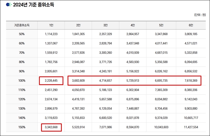 위 지표는 중위소득 100% 기준값입니다.