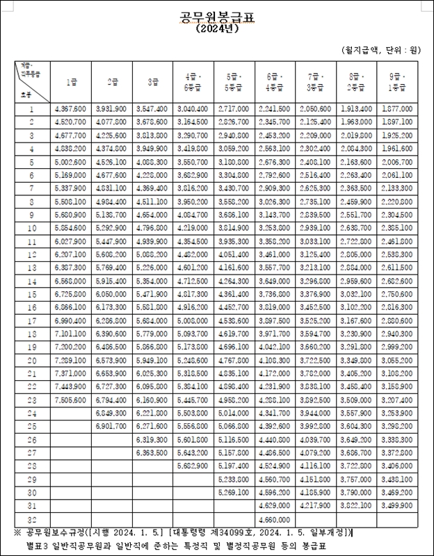 공무원 직급표에 의한 2024년 봉급표는 아래와 같습니다.