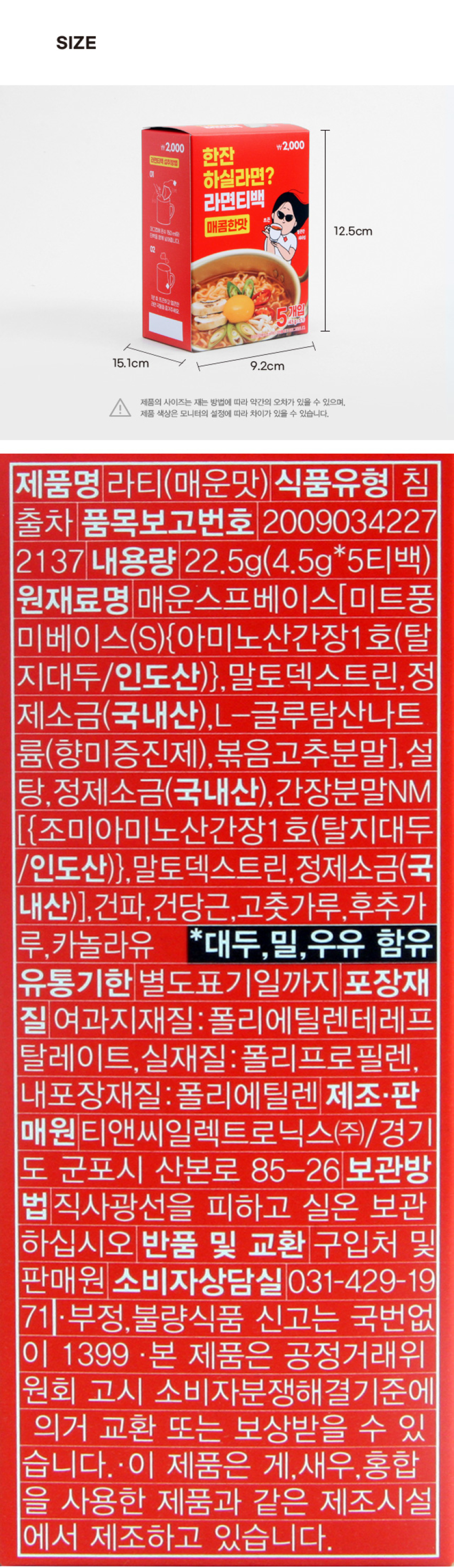 라면티백 매운맛 22.45g (4.5g X 5 티백) = 2,000원