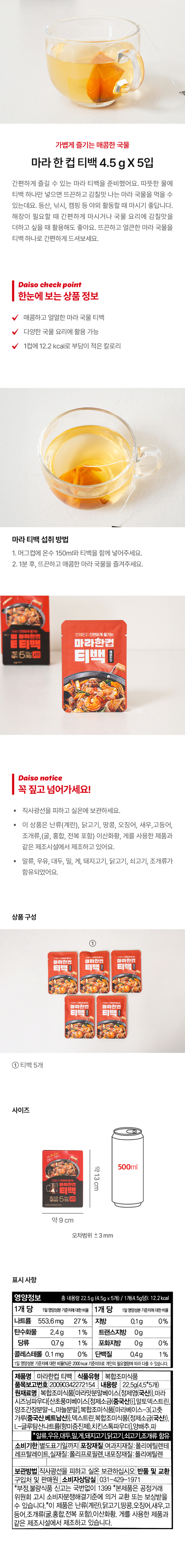 마라를 좋아하시는 분은 언제든지 간편하게 즐기는 마라티백은 4.5g X 5입 = 2,000원으로 구성되어 있습니다.