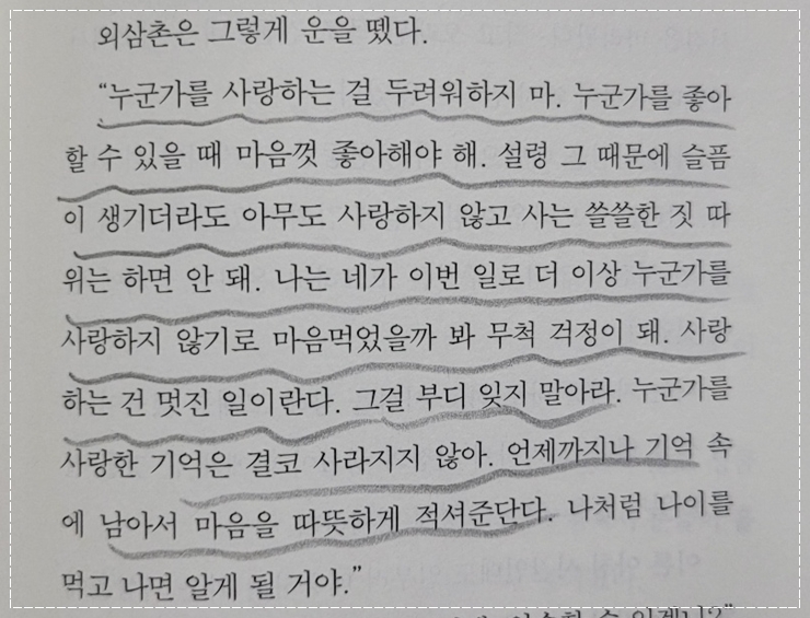 그리움과 사랑, 그러나 상처로 남는 기억의 회상을 상상하면서 때로는 가족이란 힘으로 과정을 이겨내는 모습은 책이 가진 힘과 자기성찰의 중요성과 멀리 있지 않는 가족의 힘이 거대한 힘과 새로운 출발의 근원이 되어 삶의 이정표가 되어 새로운 삶을 살아가고 있습니다.