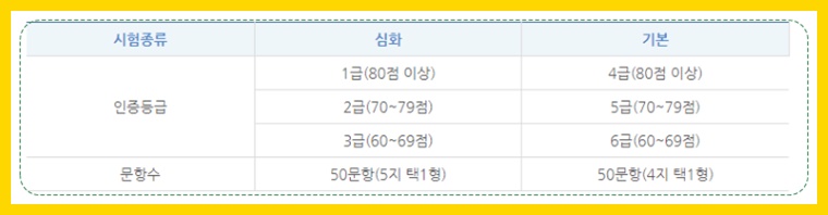 1급부터 6급까지 있으며 1급, 2급, 3급은 심화, 4급, 5급, 6급은 기본으로 문제가 통합되어 출제, 시행되고 있습니다.