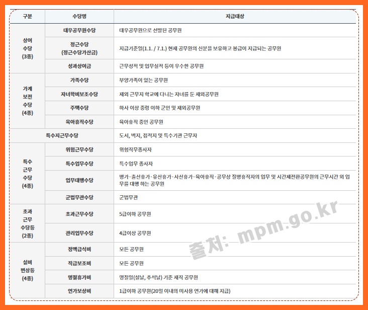 | 기술정보수당 | 5급, 월 50,000원 이하 지도관 : 월 60,000원이하 가산금 : 기술사 월50,000원이하 기사 월 30,000원이하 |