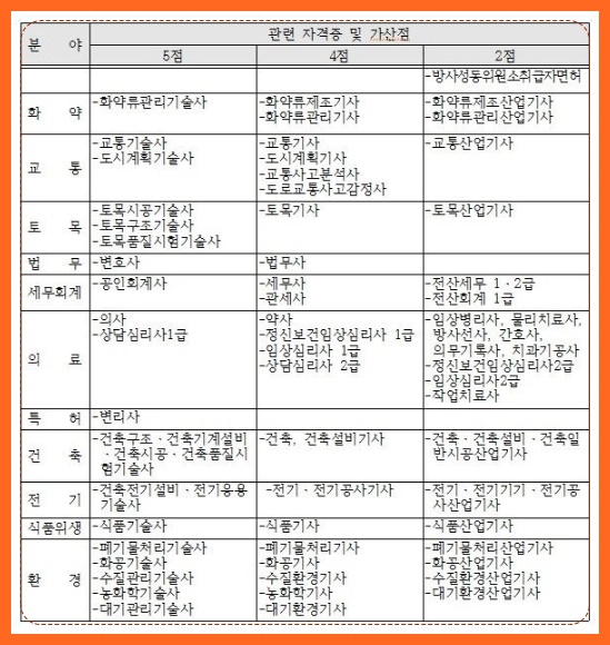 표를 기준으로 관련 자격증및 가산점을 잘 확인하시고 분야별로 있어야 할 자격증을 확인하시어 좋은 결과가 있기를 바라겠습니다.