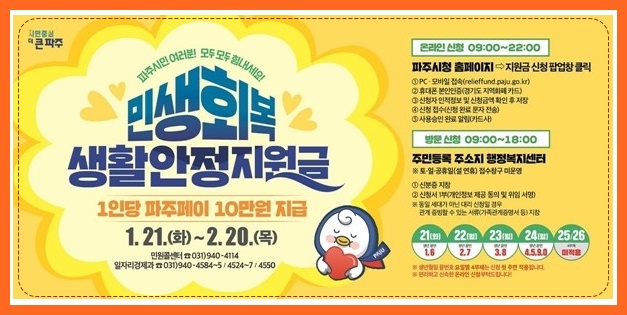이렇게 경기가 좋지 않은데 경기도 파주시에서는 지역주민을 대상으로 “민생회복 생활 안정지원금”을 지급한다고 합니다.