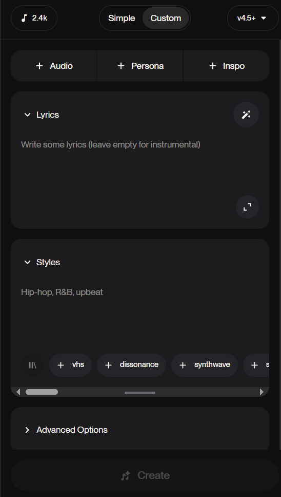 | Tip | Custom Mode | 직접 작성한 작사를 넣고 싶다면, **'Custom Mode'**를 활성화하고 'Lyrics'에 가사를, 'Style of Music'에 스타일을 입력합니다. |