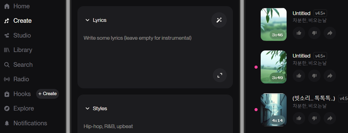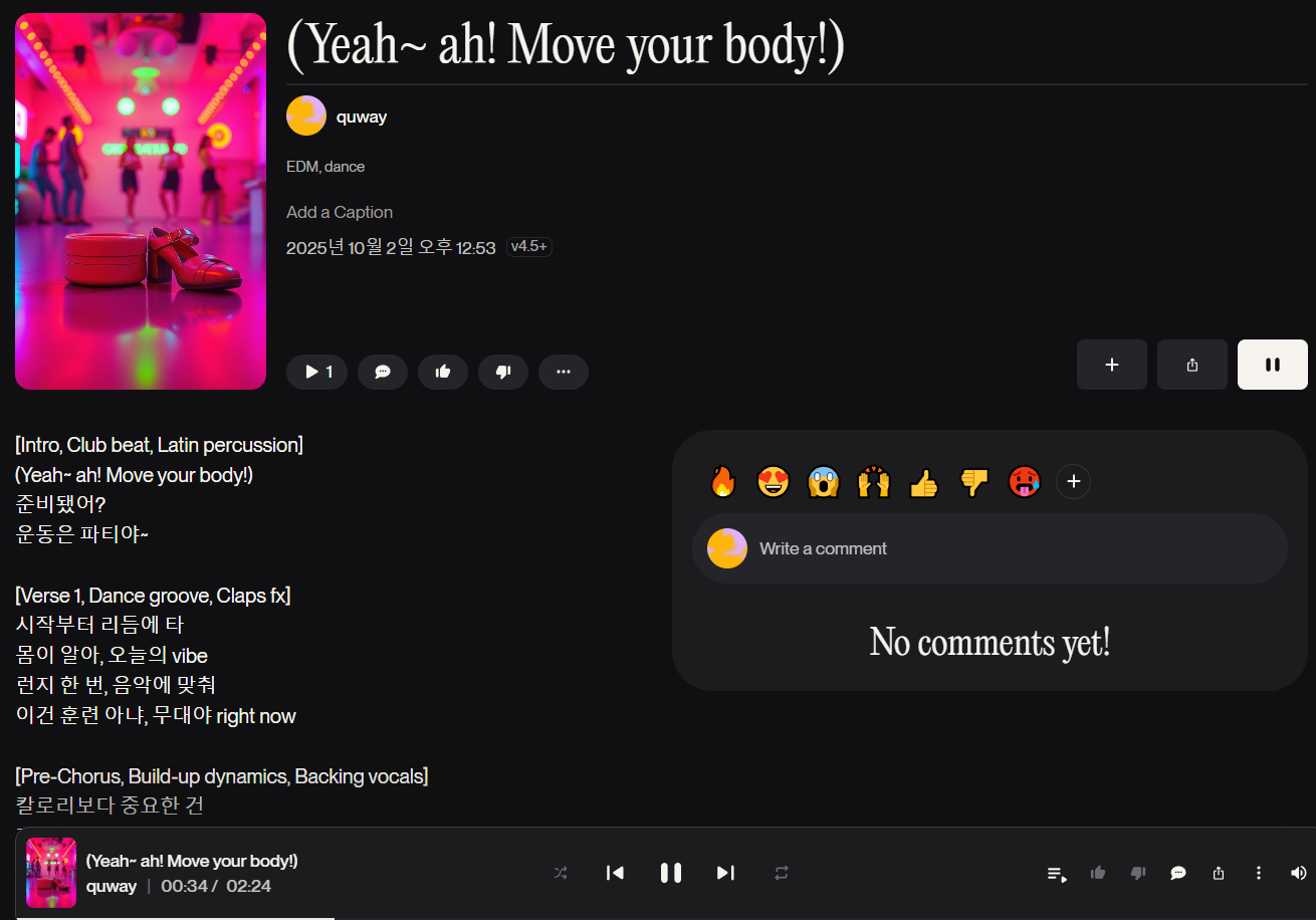 - 한국어 작사 및 보컬 지원: 글로벌 서비스임에도 불구하고 한국어 작사를 상당히 자연스럽게 처리하며, 이는 국내 사용자들에게 매우 강력한 이점으로 작용합니다. (단, 발음 최적화를 위한 프롬프트 사용법은 필수입니다.)