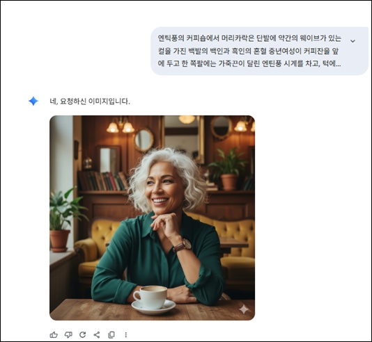 프롬프트 작성 예 : 엔틱풍의 커피숍에서 머리카락은 단발에 약간의 웨이브가 있는 컬을 가진 백발의 백인과 흑인의 혼혈 중년여성이 커피잔을 앞에 두고 한 쪽팔에는 가죽끈이 달린 엔틴풍시계를 차고, 턱에 살포시 기댄체 어딘가의 시선을 두고 하얀이를 보이면 웃고 있다.
