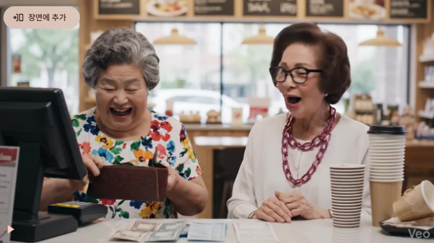- 상황: 한국 할머니가 계산서를 집으며 "더치페이 하자! 아껴서 AI 영상 만들어야 해"라고 말함 (메타적 유머 포함).