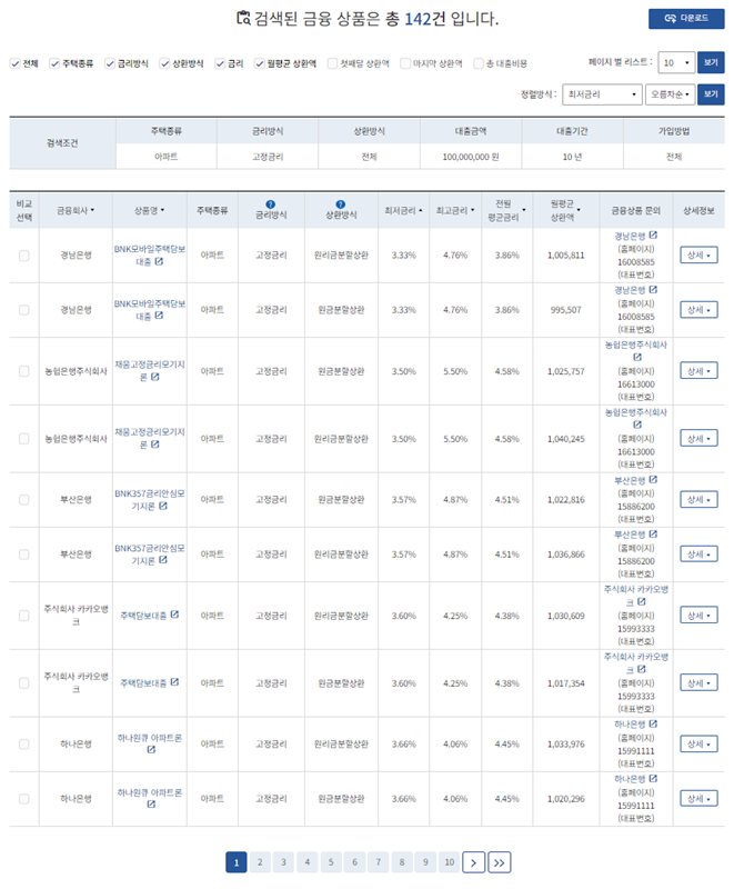 주택담보대출의 경우 설정값으로 검색하게되면 이처럼 많은 정보가 나오게 된다.