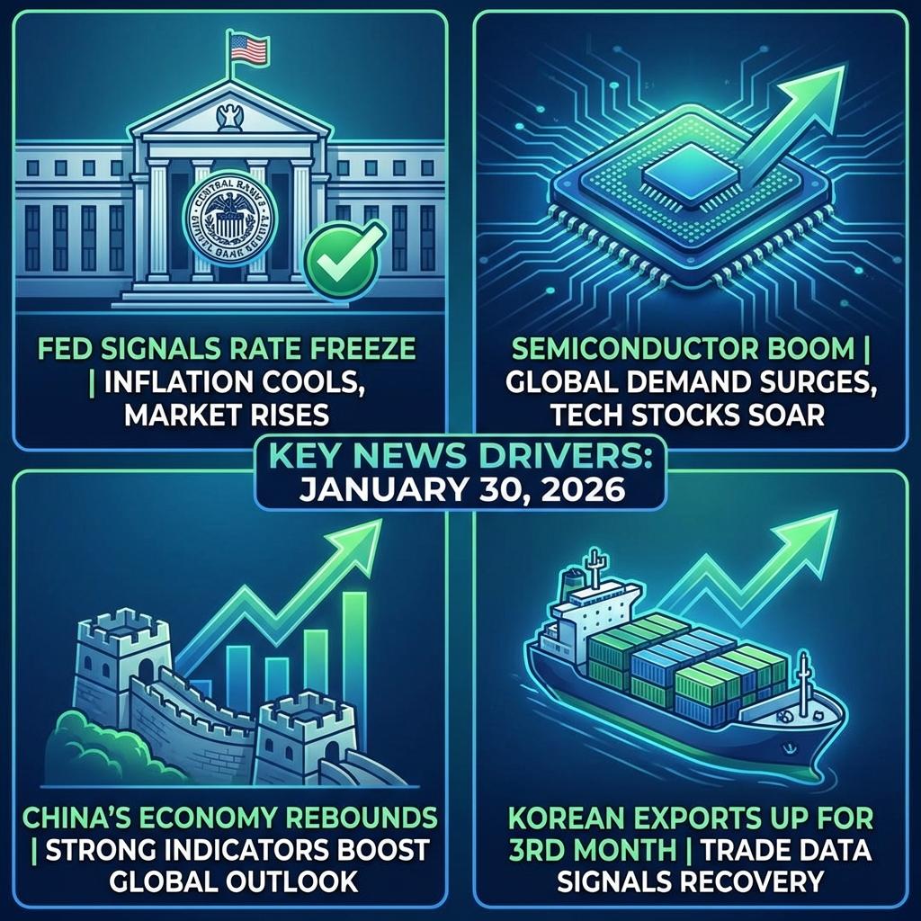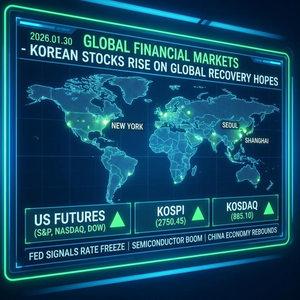 2026년 1월 30일, 글로벌 금융시장은 미국 주요 지수 선물의 소폭 상승과 함께 긍정적인 흐름을 보였습니다. 국내 증시 또한 KOSPI와 KOSDAQ 모두 상승 마감하며 견조한 흐름을 이어갔습니다. 특히 외국인 투자자들이 양 시장에서 순매수를 기록하며 시장 상승을 견인했습니다. 미국 연준의 금리 동결 시사, 글로벌 반도체 업황 회복 기대감, 중국 경제 지표 호조 등 긍정적인 대외 환경이 국내 증시에 우호적으로 작용한 것으로 분석됩니다.
