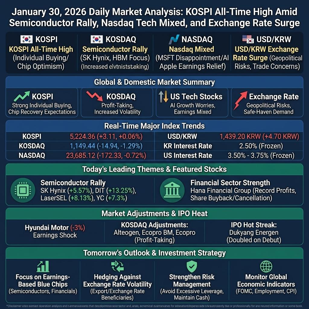 2026년 1월 30일 국내 증시는 반도체 업황 회복 기대감과 주요 대형주의 견조한 실적 발표에 힘입어 코스피가 사상 최고치를 경신하며 한 달을 마무리했습니다. 개인 투자자의 강한 매수세가 지수를 방어하며 강보합 마감했으나, 코스닥 시장은 차익 실현 매물 출회로 하락 전환하며 종목별 변동성이 확대되는 모습을 보였습니다.