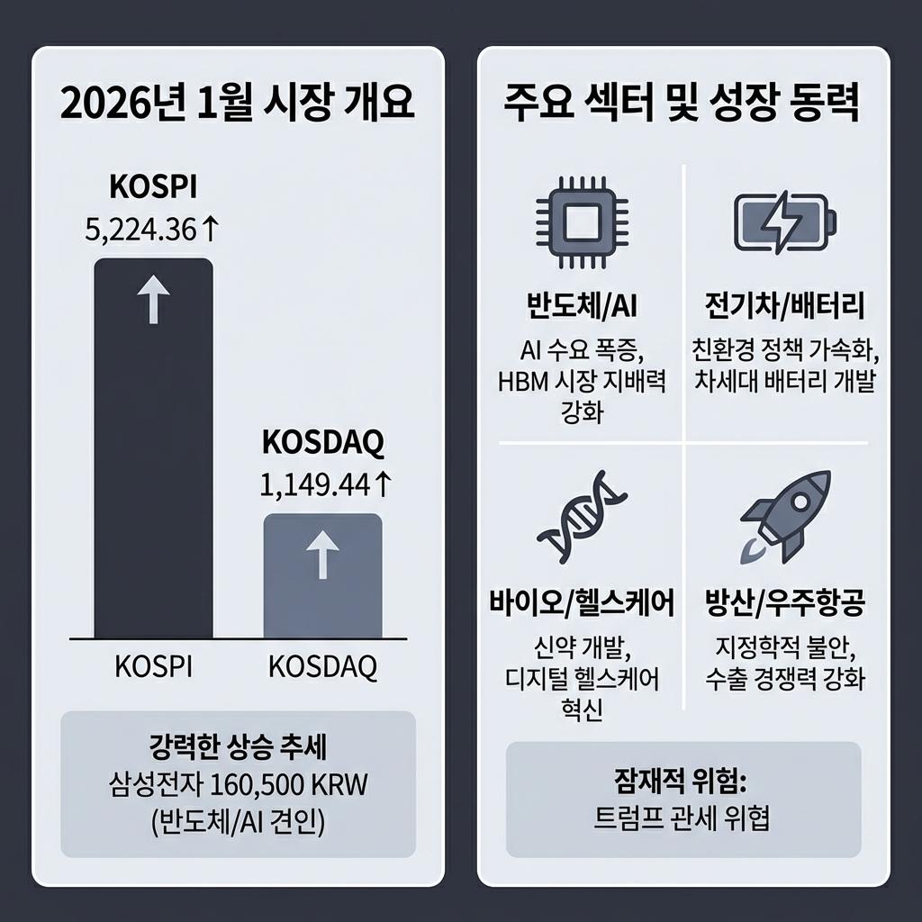 1월 한국 시장은 KOSPI 5,224.36를 기록하며 강력한 상승 모멘텀을 유지했습니다. 삼성전자(160,500 KRW)의 독주와 AI 반도체 섹터의 폭발적인 성장이 지수를 견인했습니다. 다만, 환율 1,439.50원의 고착화는 양날의 검으로 작용하고 있습니다.