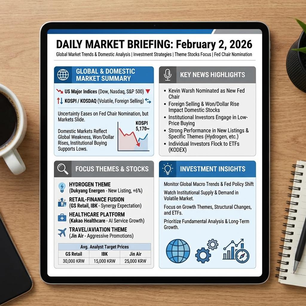 2026년 2월 2일, 글로벌 증시는 미국 주요 지수들이 하락 마감하며 투자 심리에 영향을 주었습니다. 다우존스 산업평균지수는 0.36%, 나스닥 종합지수는 0.94%, S&P 500 지수는 0.43% 각각 하락했습니다. 이러한 움직임은 도널드 트럼프 대통령이 케빈 워시 전 연방준비제도(Fed) 이사를 차기 연준 의장으로 공식 지명하면서 시장의 불확실성이 일부 해소되었다는 분석과 함께 나타났습니다.