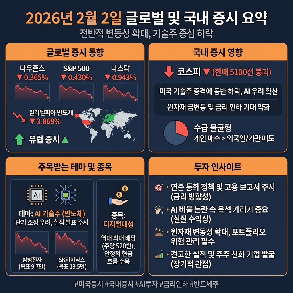 2026년 2월 2일 월요일, 글로벌 증시는 미국 증시의 하락세가 국내 시장으로 이어지며 전반적인 변동성이 확대되는 양상을 보였습니다. 지난 금요일(1월 30일) 마감된 미국 증시는 연방준비제도(Fed)의 정책 불확실성과 엇갈린 기업 실적 발표로 인해 하락 마감하며 한 주를 마무리했습니다. 다우존스 산업평균지수는 0.365% 하락했고, S&P 500 지수 또한 0.430% 내렸습니다. 특히 기술주 중심의 나스닥 종합지수는 0.943% 하락하며 가장 큰 낙폭을 기록했으며, 필라델피아 반도체 지수는 3.869% 급락하며 시장 전반의 '위험 회피' 심리를 반영했습니다. 반면, 유럽 주요 증시는 상승세를 보이며 대조를 이루었습니다.
