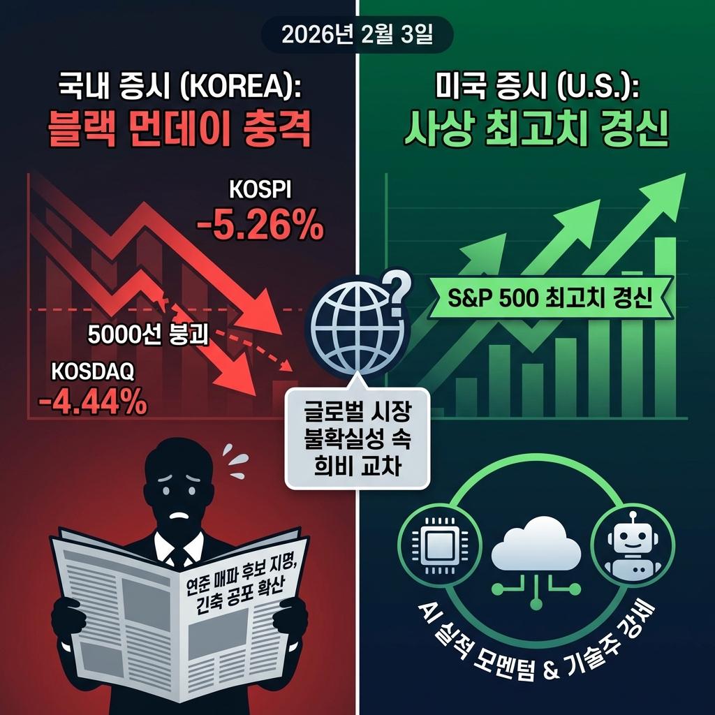 2026년 2월 2일 월요일 미국 증시는 지난주 귀금속 및 암호화폐 급락으로 인한 투자 심리 위축이 다소 완화되며 주요 지수들이 일제히 상승 마감했습니다. 특히 S&P 500 지수는 사상 최고치를 경신했으며, 기업 실적 모멘텀과 대형 기술주에 대한 관심이 시장을 주도했습니다. 반면, 2026년 2월 3일 화요일 국내 증시는 미국 연방준비제도(Fed) 차기 의장 후보 지명에 따른 긴축 우려가 증폭되며 이른바 '블랙 먼데이' 충격을 맞았습니다. 코스피는 5% 이상 급락하며 5000선이 무너졌고, 코스닥 또한 4%대 하락률을 기록하며 1100선이 붕괴되는 등 외국인과 기관의 대규모 순매도가 시장 전반의 하락을 이끌었습니다.