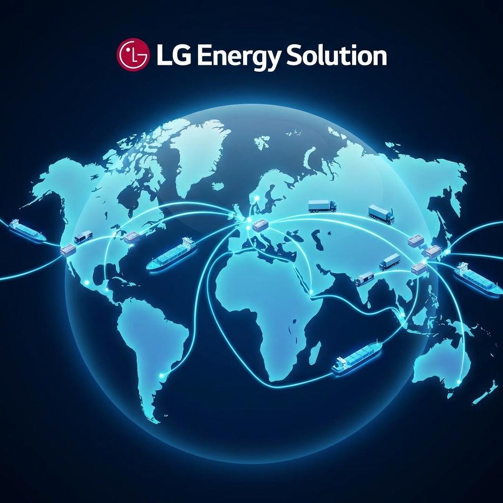 "전 세계 각 대륙에 펼쳐진 LG에너지솔루션의 배터리 생산 공장들이 위성 이미지처럼 보이며, 글로벌 시장으로 활발하게 운송되는 시각적 연결..."