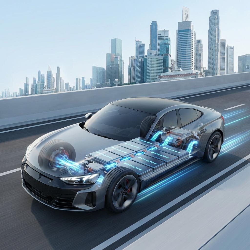 "첨단 기술이 집약된 미래형 배터리 셀이 전기차에 동력을 공급하며 고속도로를 달리는 모습, 역동적이고 푸른 에너지 흐름이 셀과 차량을 연결한다..."