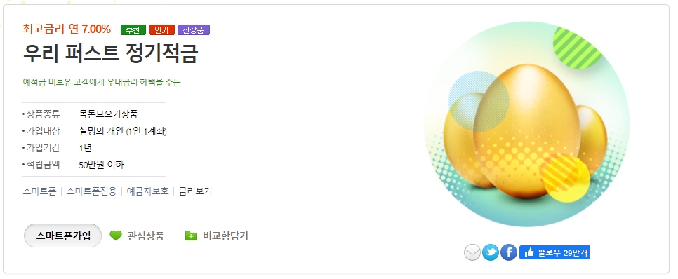 새해에 들어서 금리는 점차 내려가는 추세를 보이고 있는데 우리은행에서 정기적금의 년 7% 상품이 있어 소개해 드립니다.