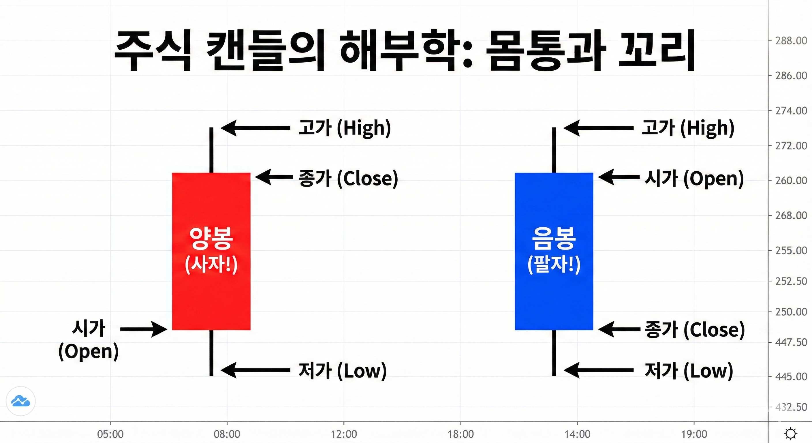 캔들은 크게 두 부분으로 나뉩니다. 두꺼운 **'몸통'**과 위아래로 삐져나온 얇은 **'꼬리'**입니다. 아래 이미지를 보시면 한눈에 이해가 되실 겁니다.