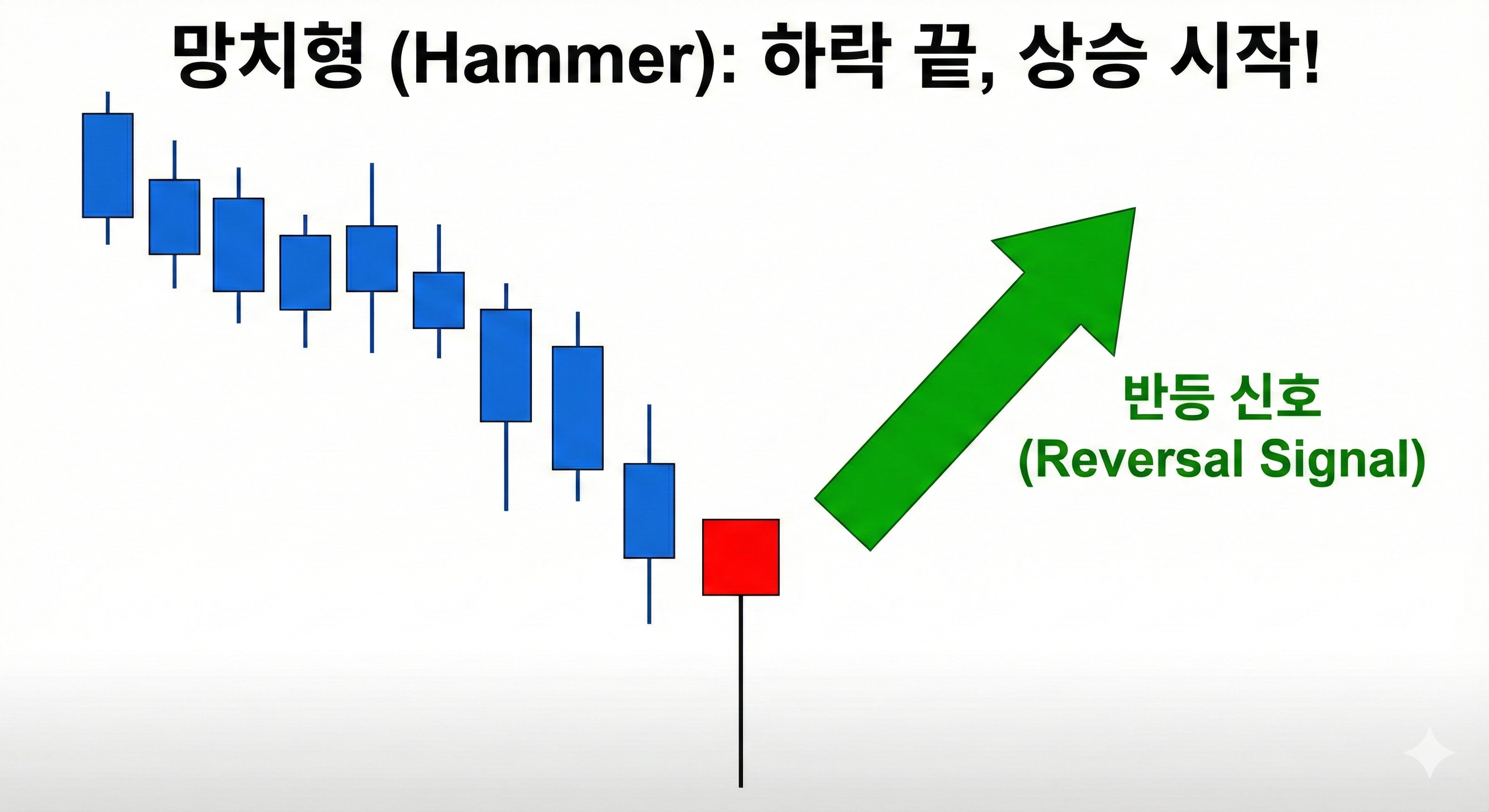 • 대응: 주가가 계속 하락하다가 바닥권에서 이 모양이 뜨면 **"이제 하락을 멈추고 반등한다"**는 강력한 신호입니다.