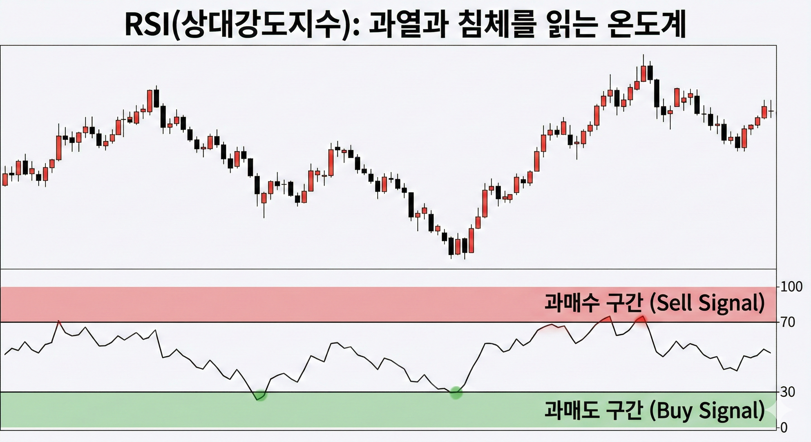 RSI는 현재 주가가 과열(너무 많이 삼)되었는지, 침체(너무 많이 팜)되었는지를 0~100 사이의 숫자로 보여주는 **'과매수/과매도 측정기'**입니다. 마치 고무줄을 너무 당기면 다시 돌아오려는 성질과 같습니다.