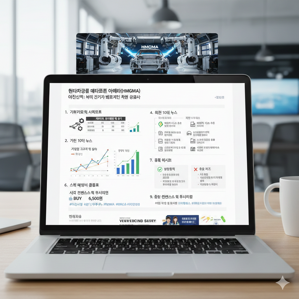 - 의견 요약: 현재 주가는 실적 성장세 대비 저평가(P/E 6배 수준) 구간에 머물러 있으며, HMGMA 가동에 따른 실적 퀀텀 점프가 기대되는 시점입니다.
