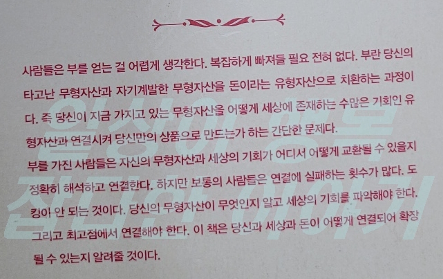 내용을 읽어보면 멀리서 찾지 말고 그 동안 나 자신의 캐리어와 자기계발을 통한 무형자산을 우리가 목적하는 돈이라는 유형자산으로 바꾸는 과정을 연결만 하면 된다는 것입니다.