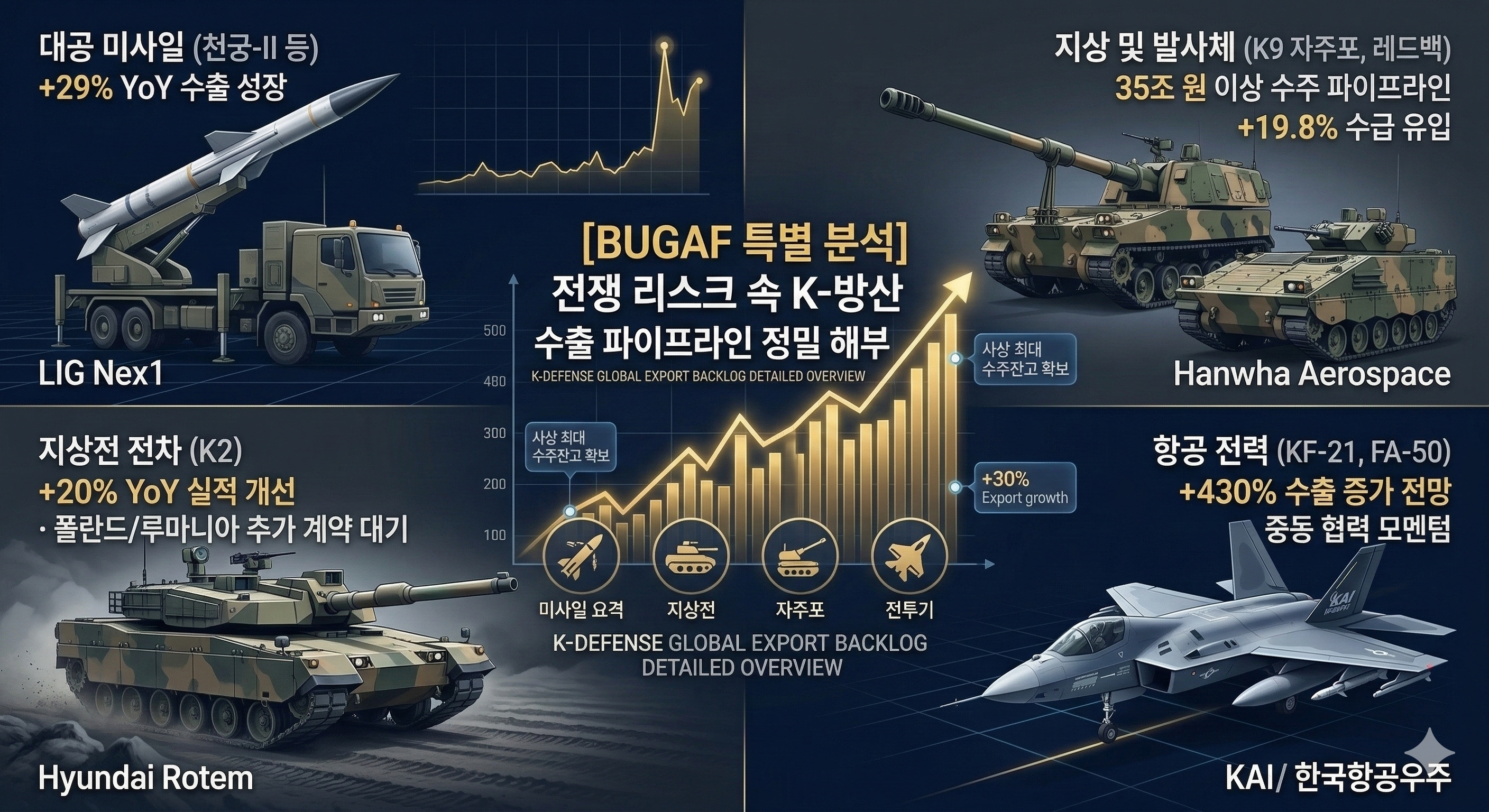 {image_generation: A highly detailed, professional financial analysis infographic split into four quadrants, representing the Korean defense stock sector in March 2026. Top-left: A sophisticated surface-to-air missile interceptor (representing LIG Nex1). Top-right: A self-propelled howitzer and armored vehicle (Hanwha Aerospace). Bottom-left: A modern main battle tank (Hyundai Rotem). Bottom-right: An advanced supersonic fighter jet (KAI). The center features a glowing golden stock chart with an upward trend and the text 'K-Defense Export Pipeline'. Dark, tactical, modern aesthetic.}