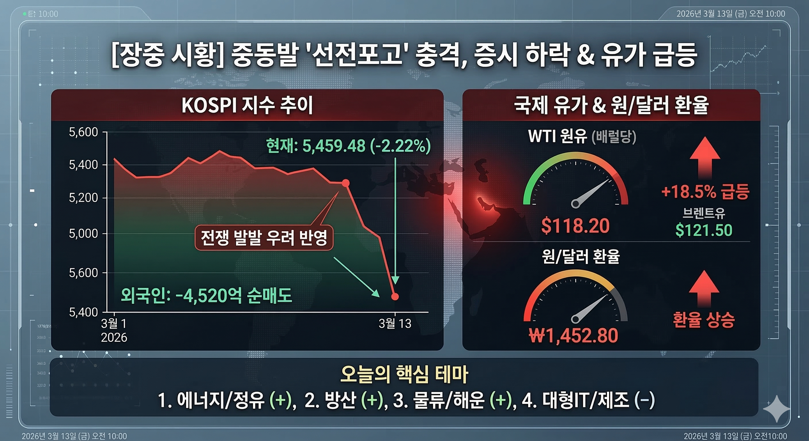 오전 시장은 공포 심리가 지배하고 있습니다. 오후 장에서 외국인의 매도세 진정 여부와 유가 선물 지수의 추이가 관건입니다. 내일은 주말을 앞둔 만큼 리스크 회피 물량이 추가로 나올 수 있으니, 에너지 및 방산주의 연속성을 체크하되 대형 우량주의 낙폭 과대 구간 진입 여부를 모니터링하시기 바랍니다.