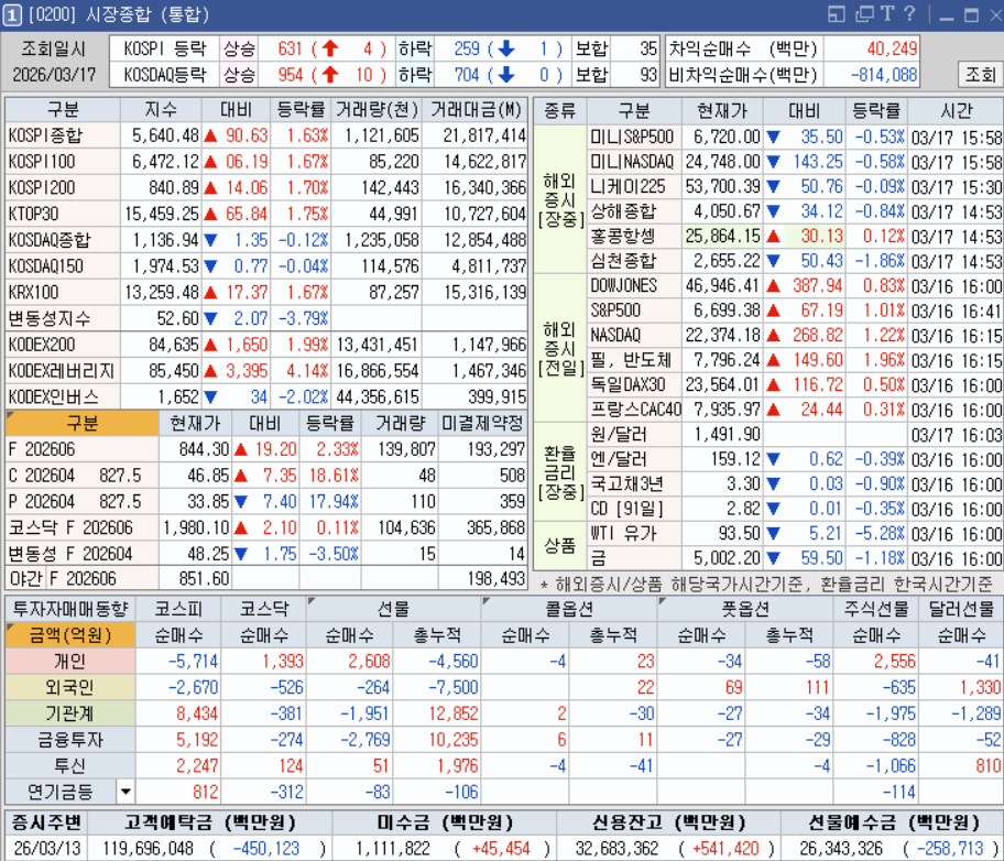 [2026-03-17 마감분석] 기관의 8,400억 폭풍 매수, 코스피 5,640선 안착 (코스닥은 소외)