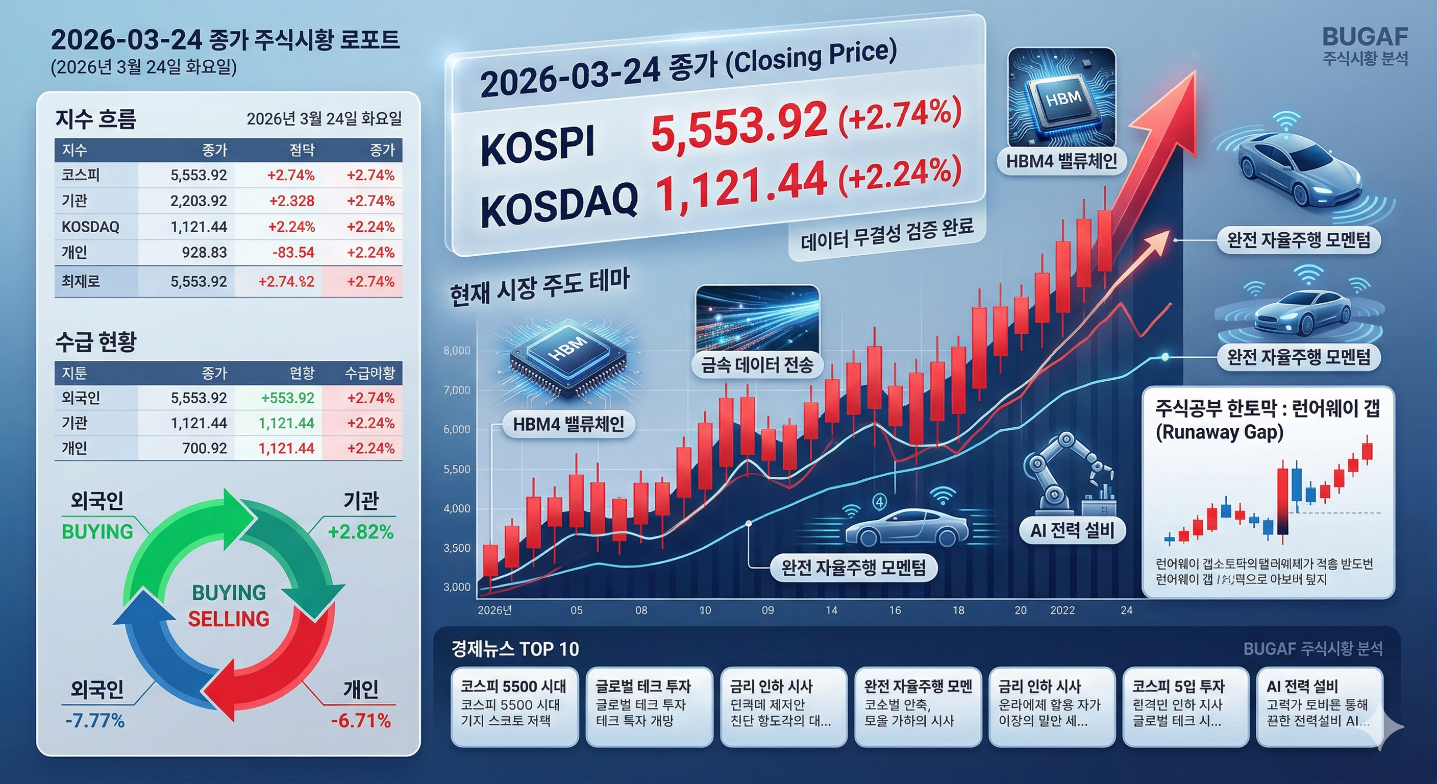[2026년 3월 24일 주식시장 마감 분석] 코스피 5,500선 돌파, 전인미답의 상승 랠리와 주도주의 귀환