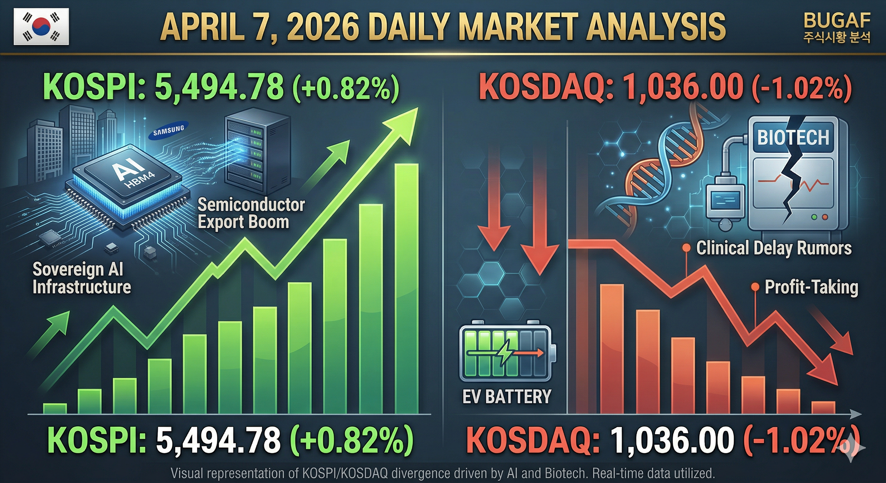 ![2026년 4월 7일, 대한민국 증시의 '디커플링' 현상을 상징하는 시각화 자료. 코스피는 삼성전자와 반도체를 중심으로 강한 상승을, 코스닥은 하락하는 대조적인 그래프와 인공지능 반도체 칩이 결합된 전문적인 경제 인포그래픽.]