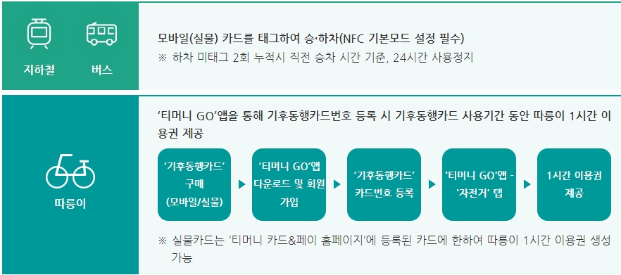 ● 서비스범위(사용처) : 서울시내 지하철과 시내버스, 마을버스, 따릉이(공공자전거)