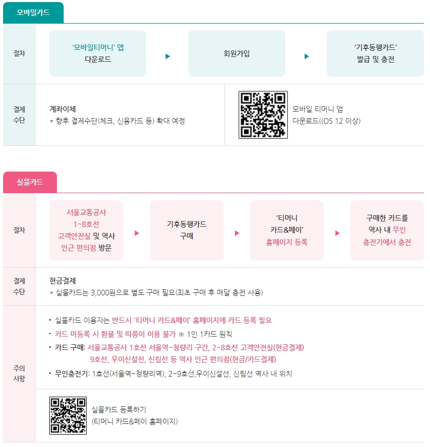 ● 기후동행카드 종류 : 실물카드, 모바일(안드로이드, IOS기반, 휴대전화)