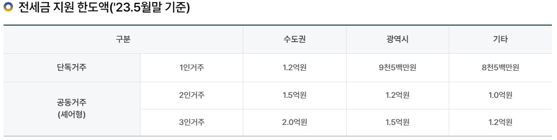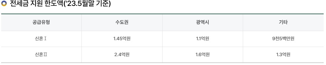-임대보증금 : 지원한도액 범위 내에서 전세보증금의 5%(신혼Ⅰ), 20%(신혼Ⅱ)