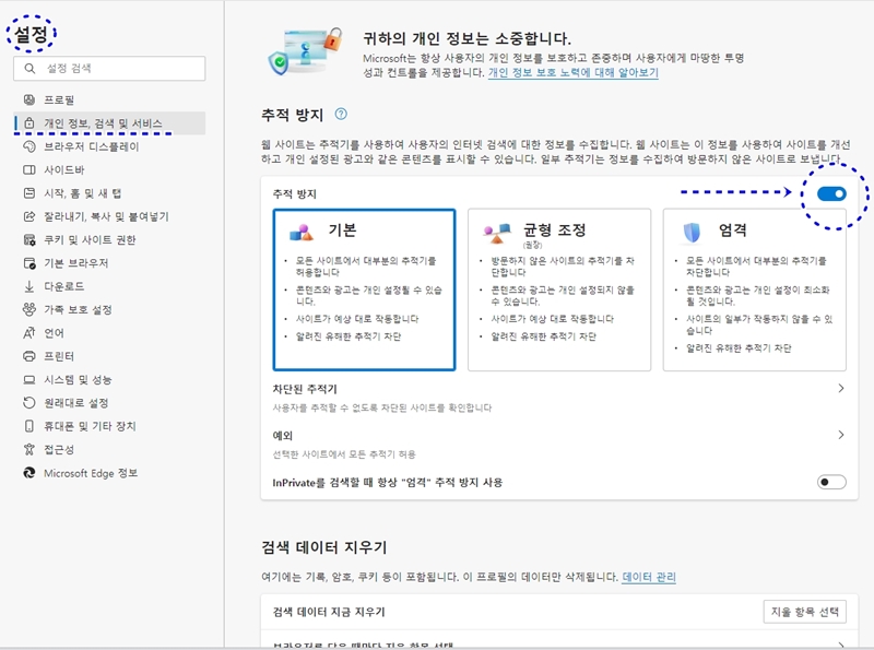 4. 브라우져의 설정 → 개인정보 검색 및 서비스