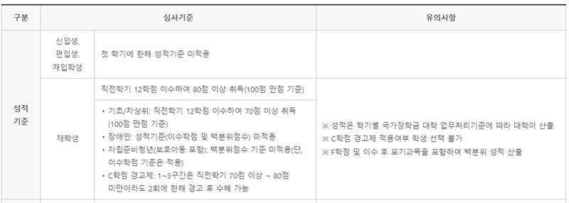 ● 재학생은 직전학기 12과목 이상 이수, 80점(B)이상 취득해야 하고, 기초수급자의 경우는 70점(C)이상이 되어야 합니다.