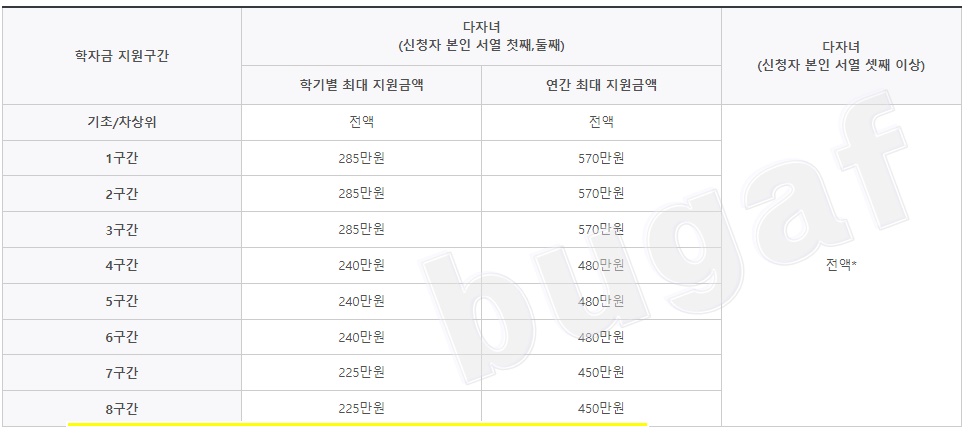 - 소득구간은 한국장학재단에서 근로소득, 사업소득, 재산소득, 기타소득의 합계액을 기반으로 산정합니다.