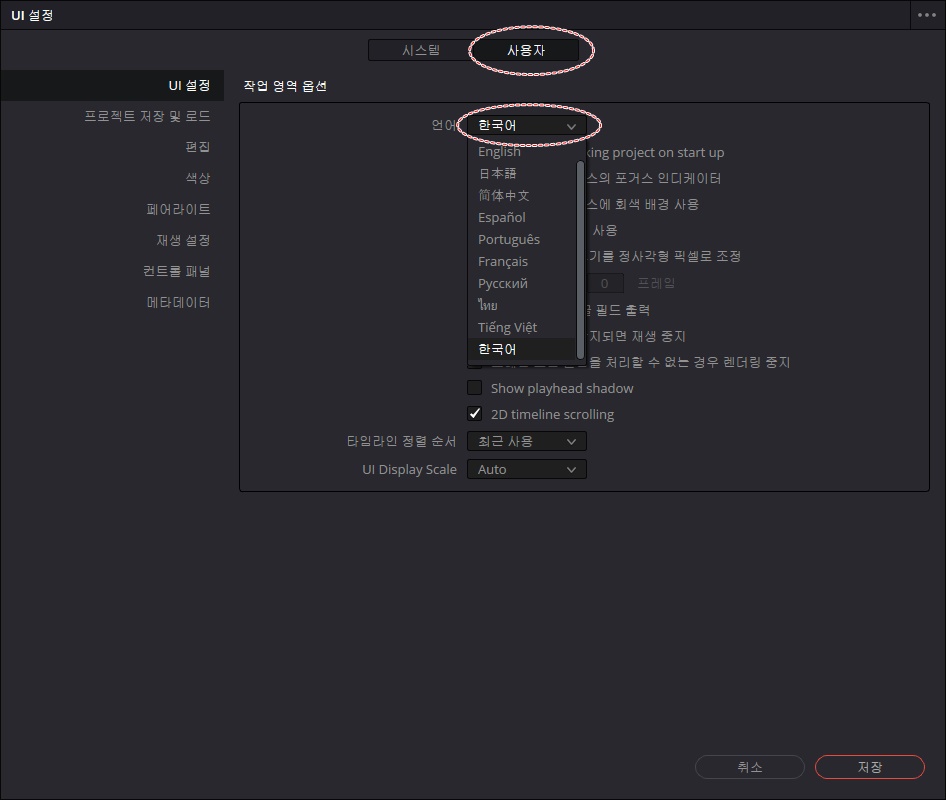 4. General 선택 중앙메뉴 User 선택 Language → 한국 → Save → 프로그램 재실행 (한국어 실행됨)